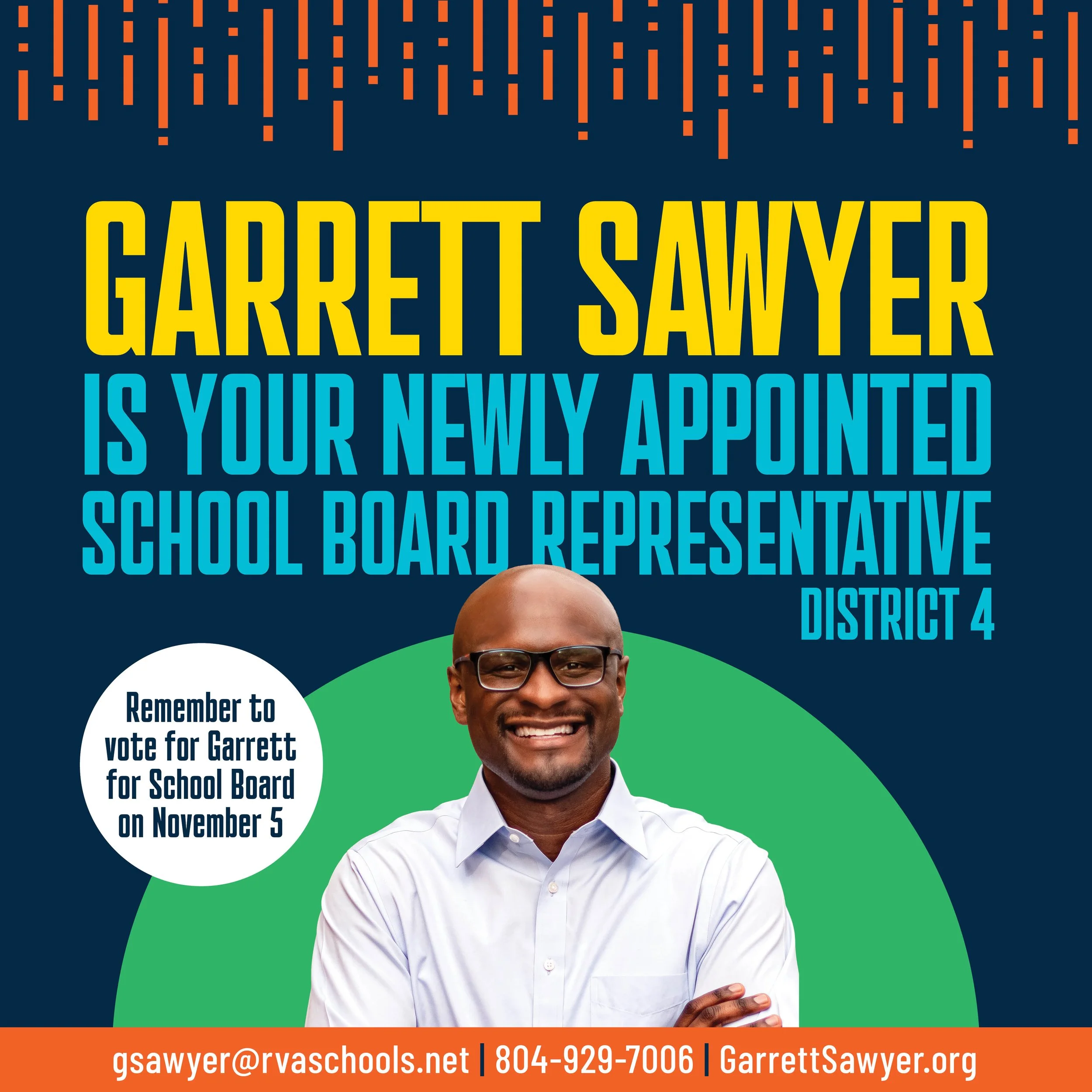 Logo, brand identity, website, social postsand printed collateral for Garrett Sawyer for Richmond School Board. Social posts